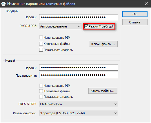При этом должна быть включена опция Режим TrueCrypt, как показано на иллюстрации: