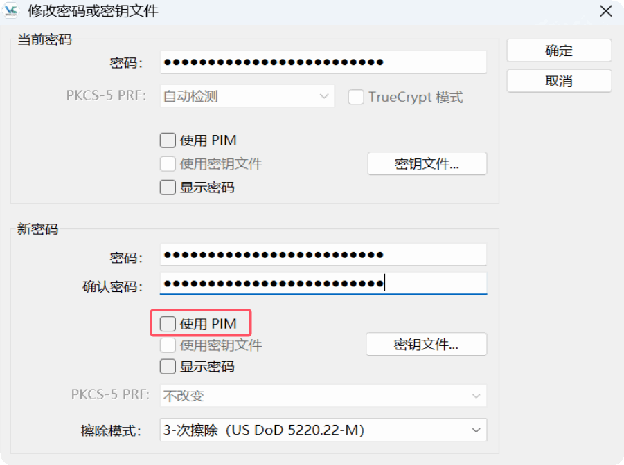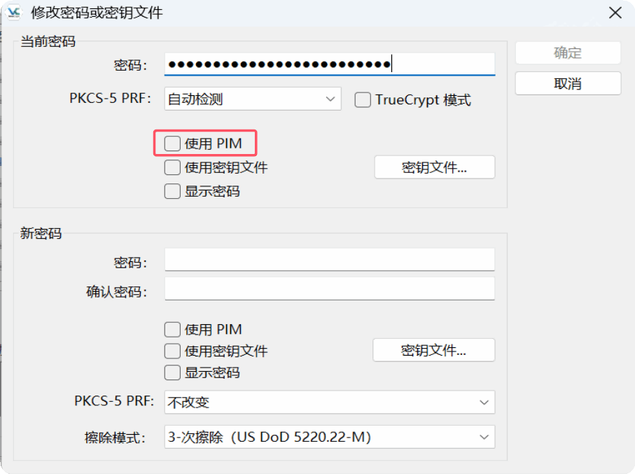 在创建卷或更改密码时,用户可以通过选中“使用PIM”复选框来指定PIM值,这样GUI中会显示一个PIM字段,用户可以输入PIM值。