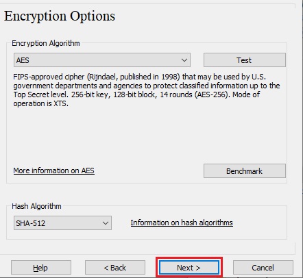 Here you can choose an encryption algorithm and a hash algorithm for the volume. If you are not sure what to select here, you can use the default settings and click