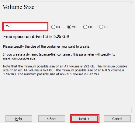 Here we specify that we wish the size of our VeraCrypt container to be 250 megabyte. You may, of course, specify a different size. After you type the desired size in the input field (marked with a red rectangle), click