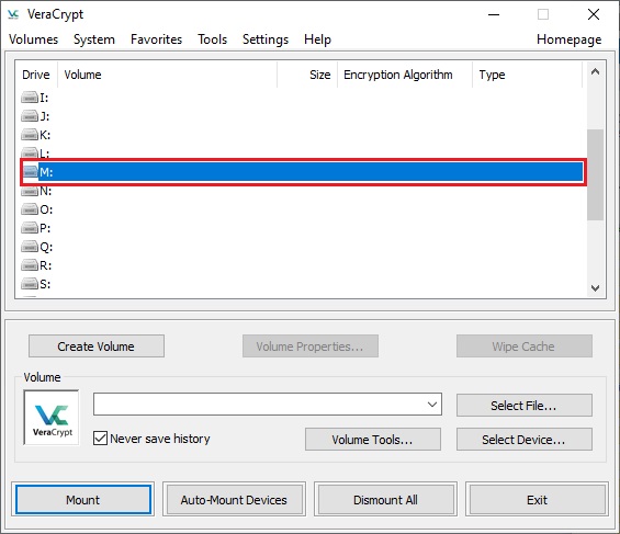 In the remaining steps, we will mount the volume we just created. We will return to the main VeraCrypt window (which should still be open, but if it is not, repeat Step 1 to launch VeraCrypt and then continue from Step 13.)